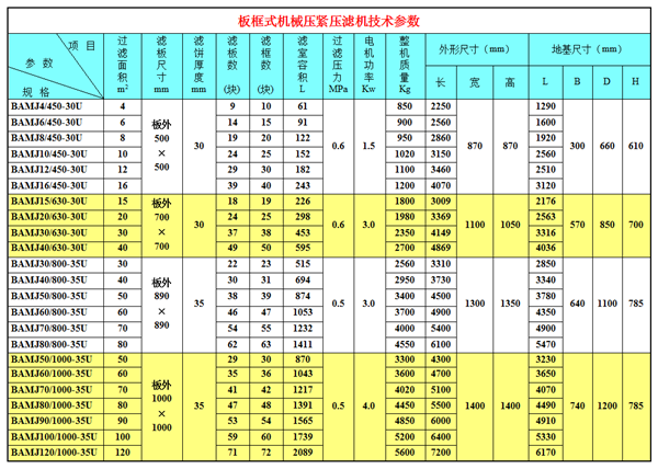 板框式機械壓緊壓濾機技術(shù)參數(shù)